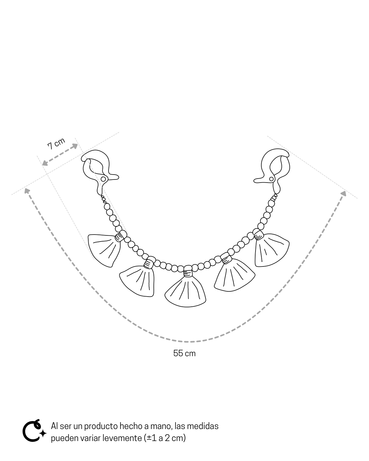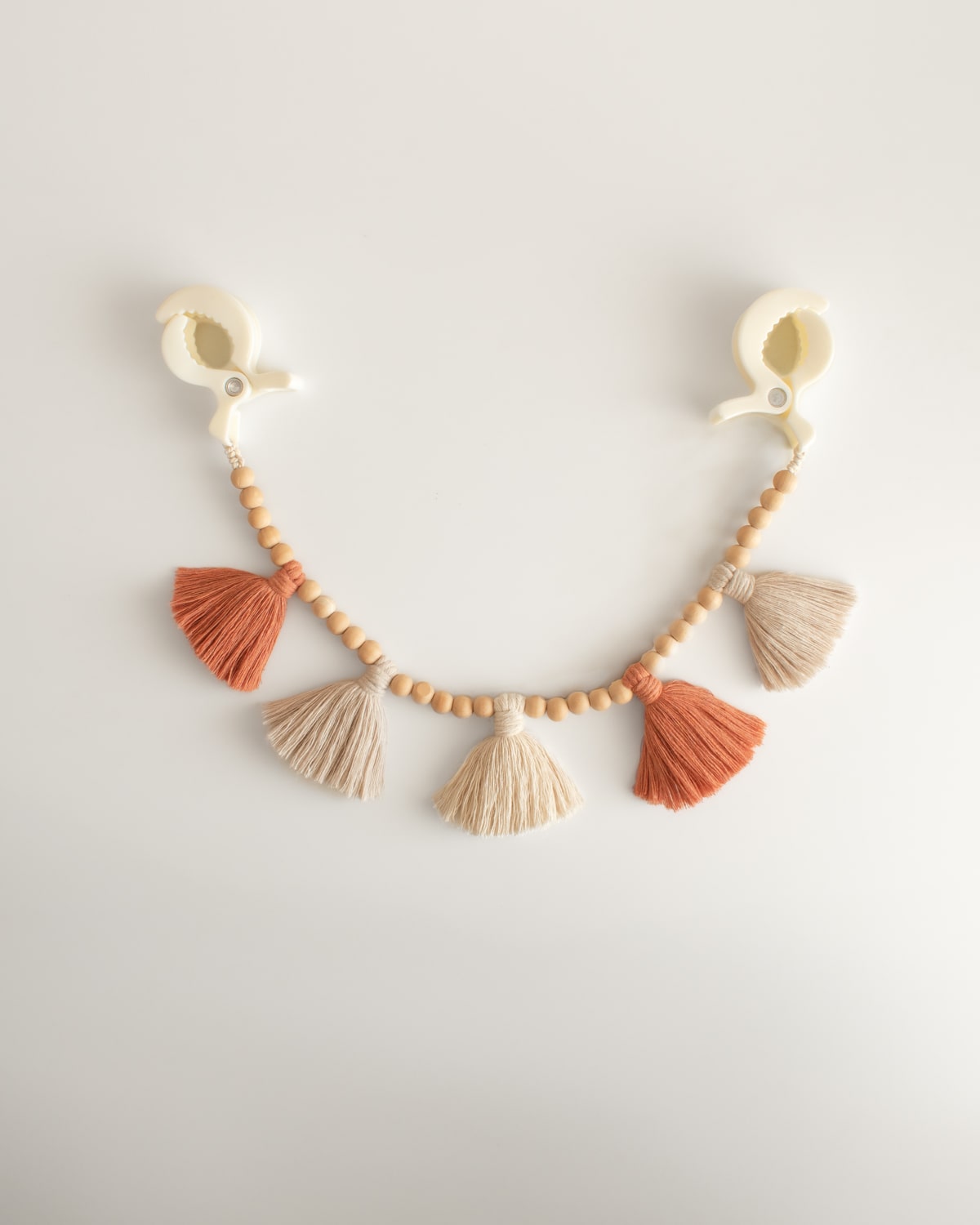 Esta guirnalda es el toque ideal para personalizar el coche de tu bebé. Hecha con pompones de algodón natural en colores suaves y cuentas de madera, se puede fijar fácilmente gracias a las pinzas en los extremos, ya sea en el coche, el huevito o la cuna, agregando un toque acogedor donde quiera que esté. Además de ser un accesorio bonito y tierno, esta guirnalda también sirve como estímulo visual para tu guagüita, manteniéndola entretenida y observando mientras sale a pasear.
