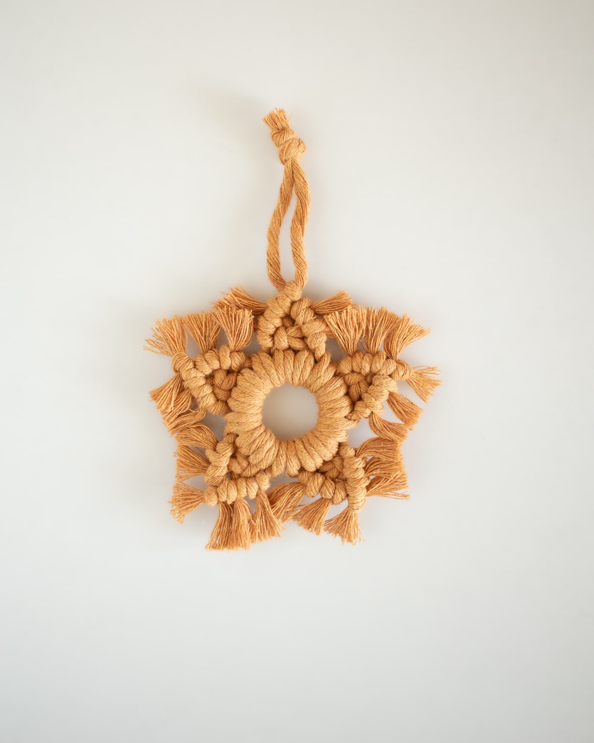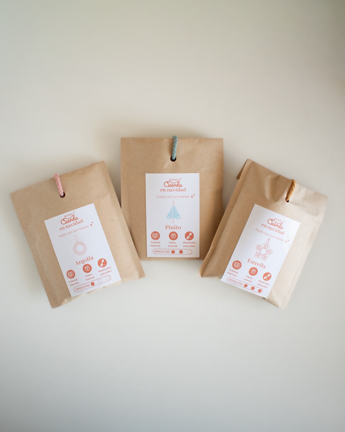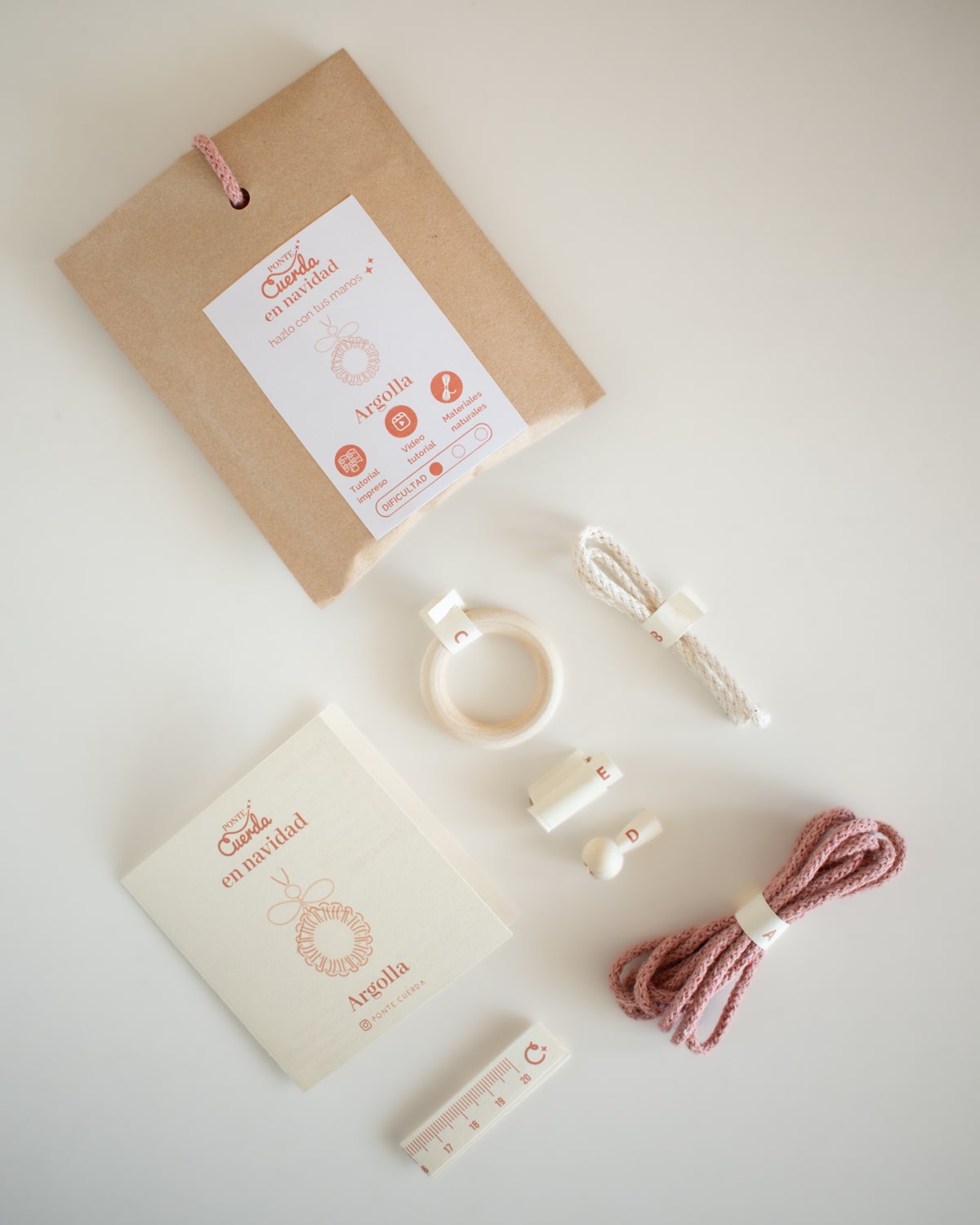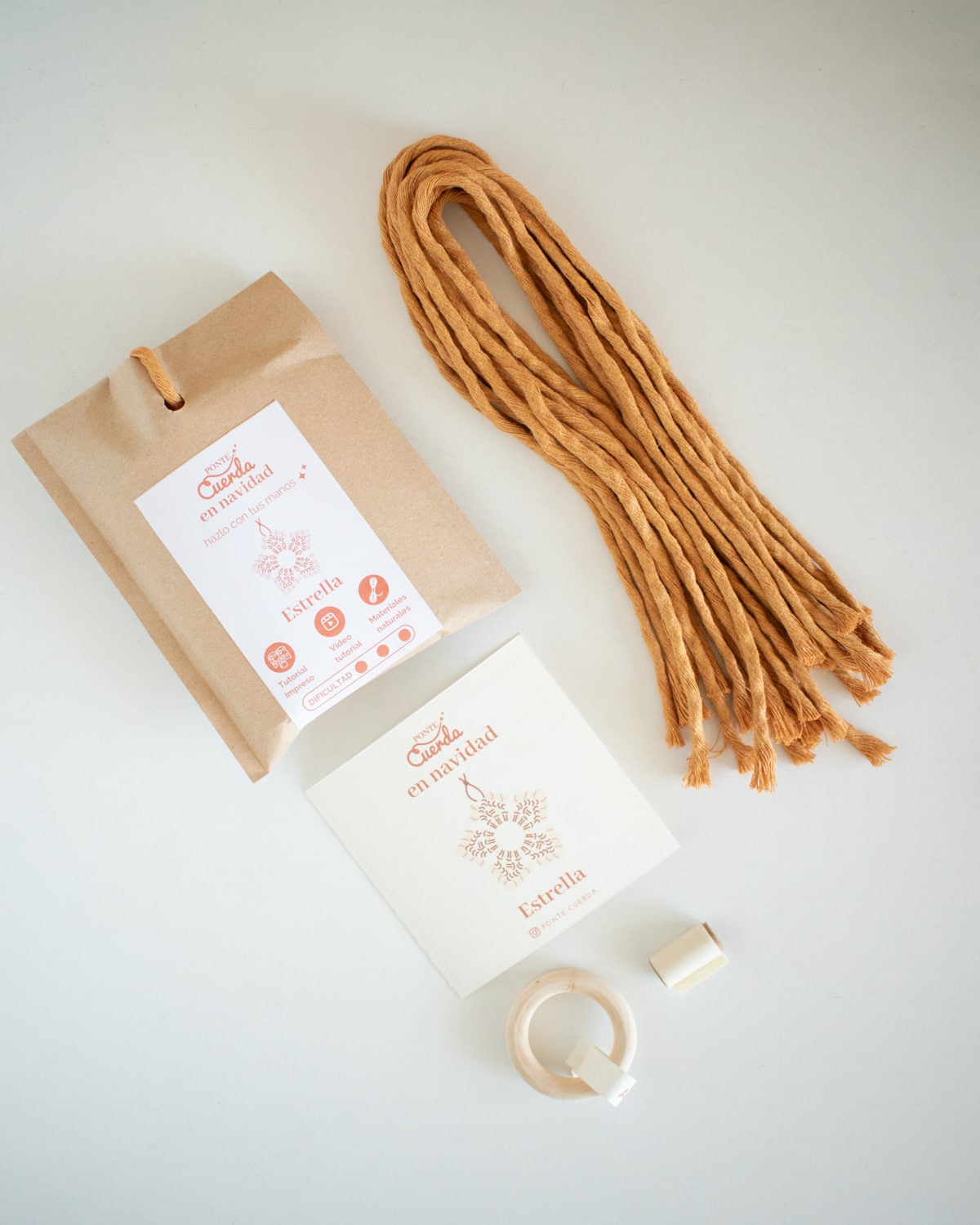 Contenido del kit macramé – Estrella Navideña: Cuerdas de algodón natural y reciclado / Argolla de madera / Masking Tape / Tutorial impreso / Video tutorial.