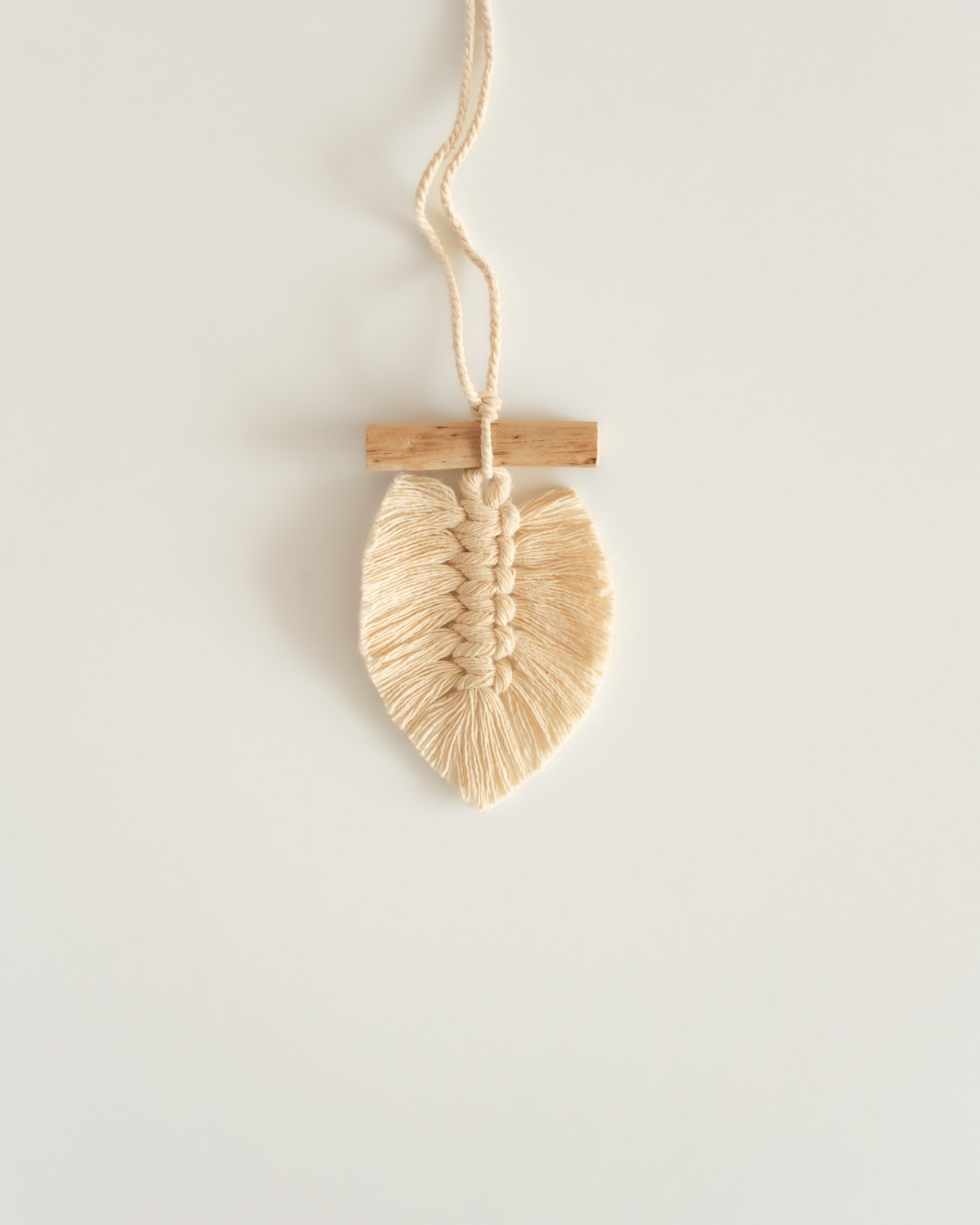 Este mini colgante en forma de hoja es perfecto para añadir un toque único a tu ambiente. Hecho a mano con materiales naturales, cuerdas de algodón recicladas de productos más grandes y un palito de madera recolectado en el bosque.