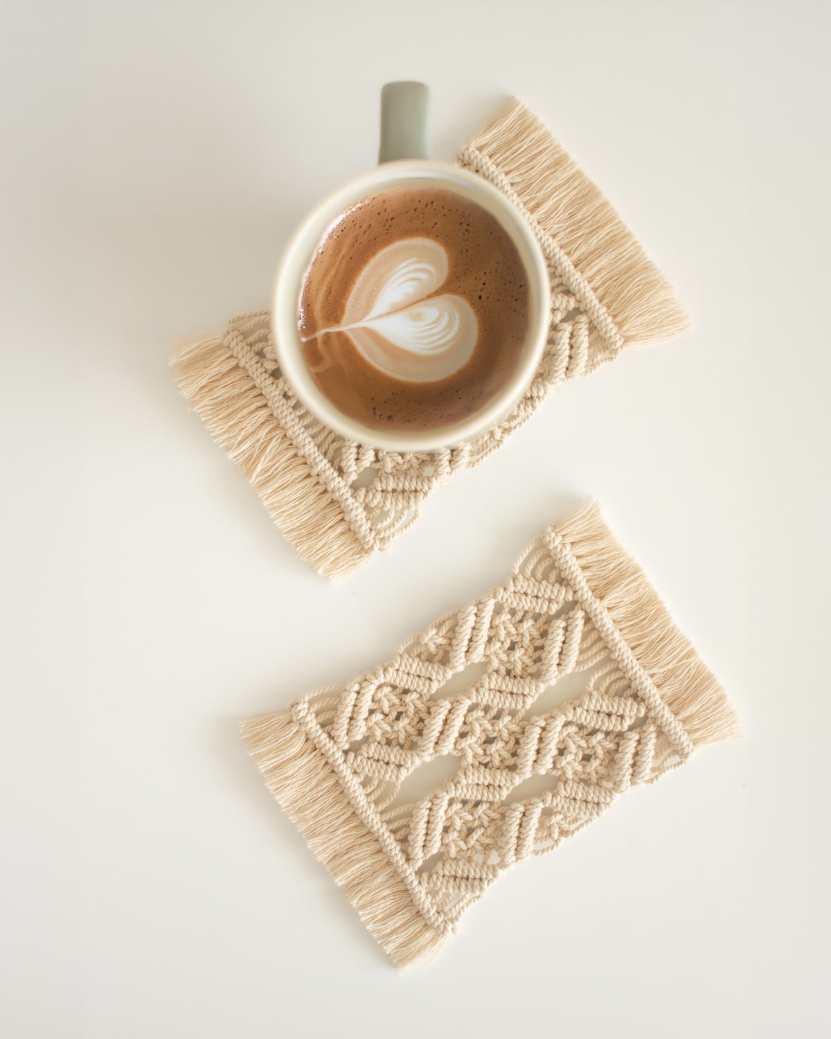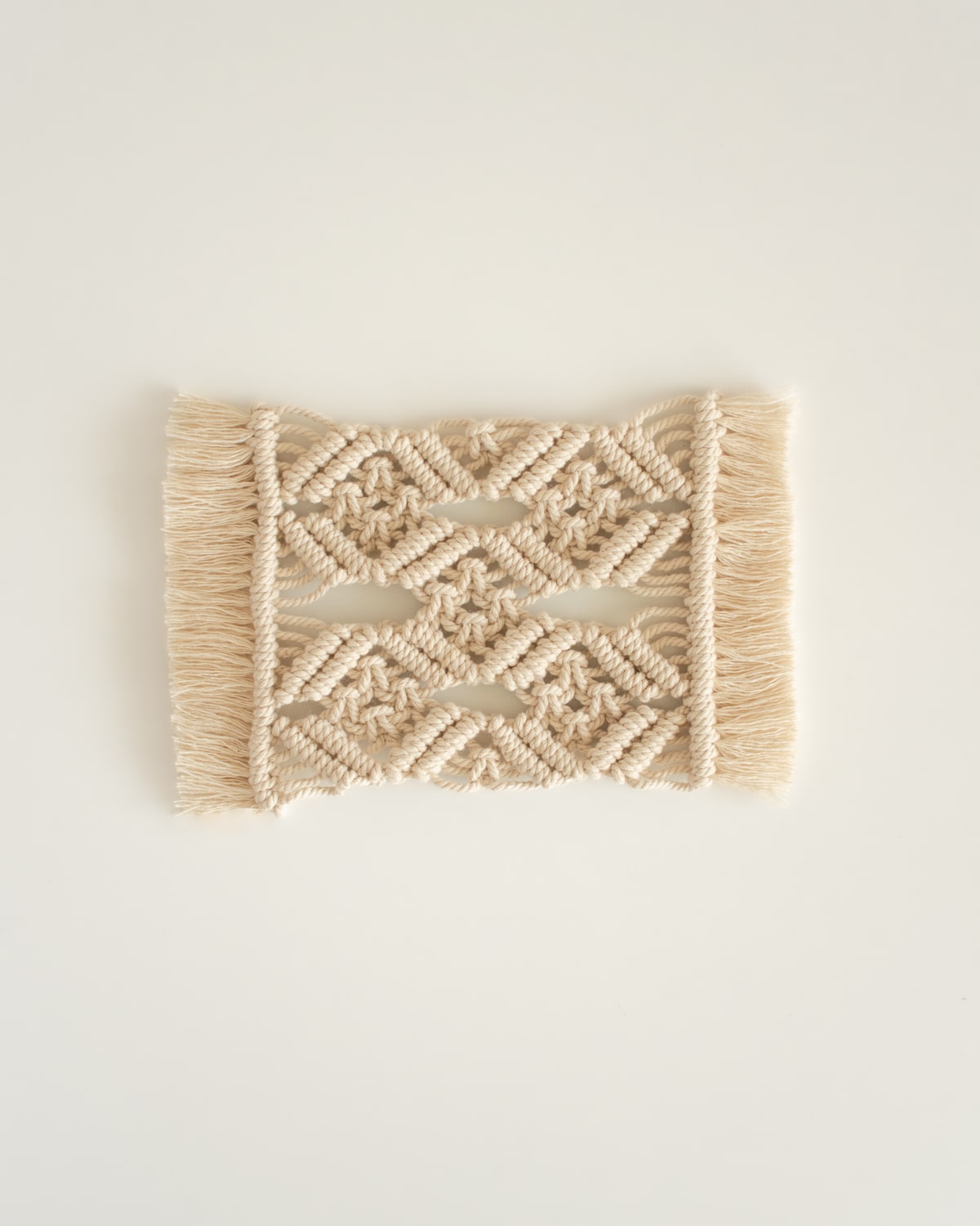 Cuidados: Lavar el posavasos de macramé a mano con agua fría y jabón neutro, con movimientos suaves para cuidar las fibras.