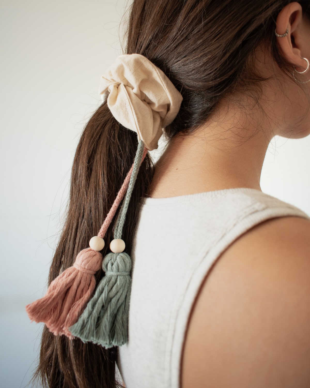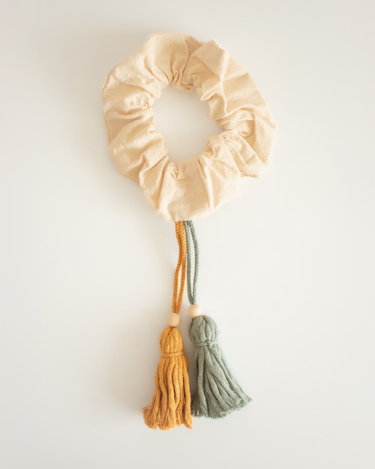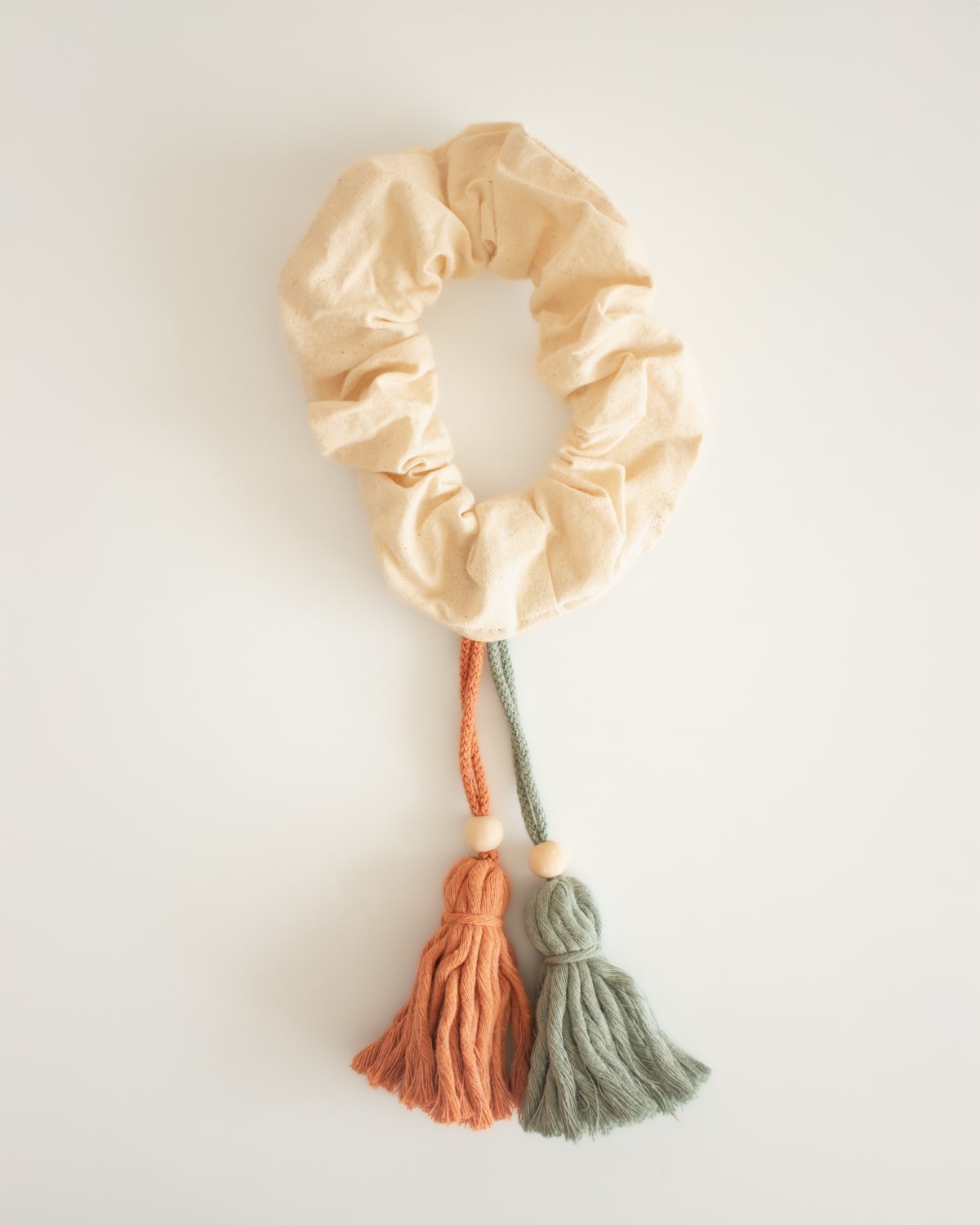 Cambia tu peinado de básico a boho chic y relajado al instante. Hechos a mano con tela de crea natural y pompones de cuerdas de algodón reciclado, este scrunchie pompones es el complemento perfecto para tu día a día.