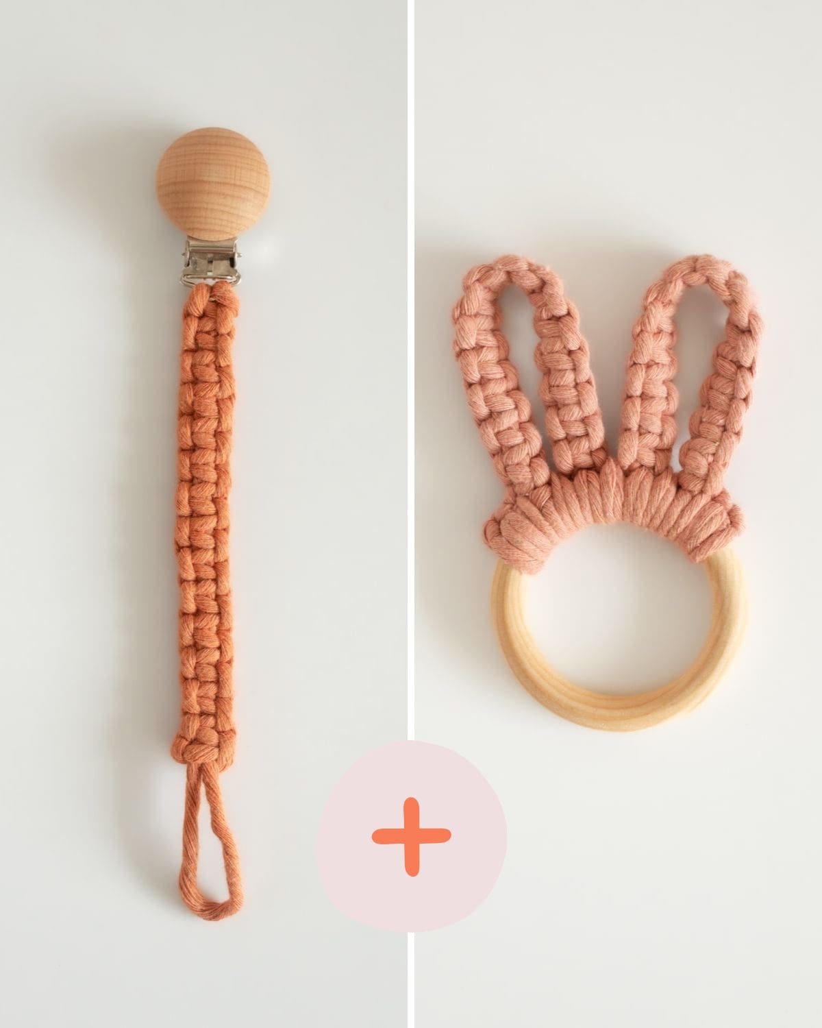 Hecho a mano pensado para las guagüitas. El set Bebé incluye un mordedor con diseño de orejitas de conejo y un porta chupete de macramé, elaborados con materiales naturales y certificados para uso infantil.