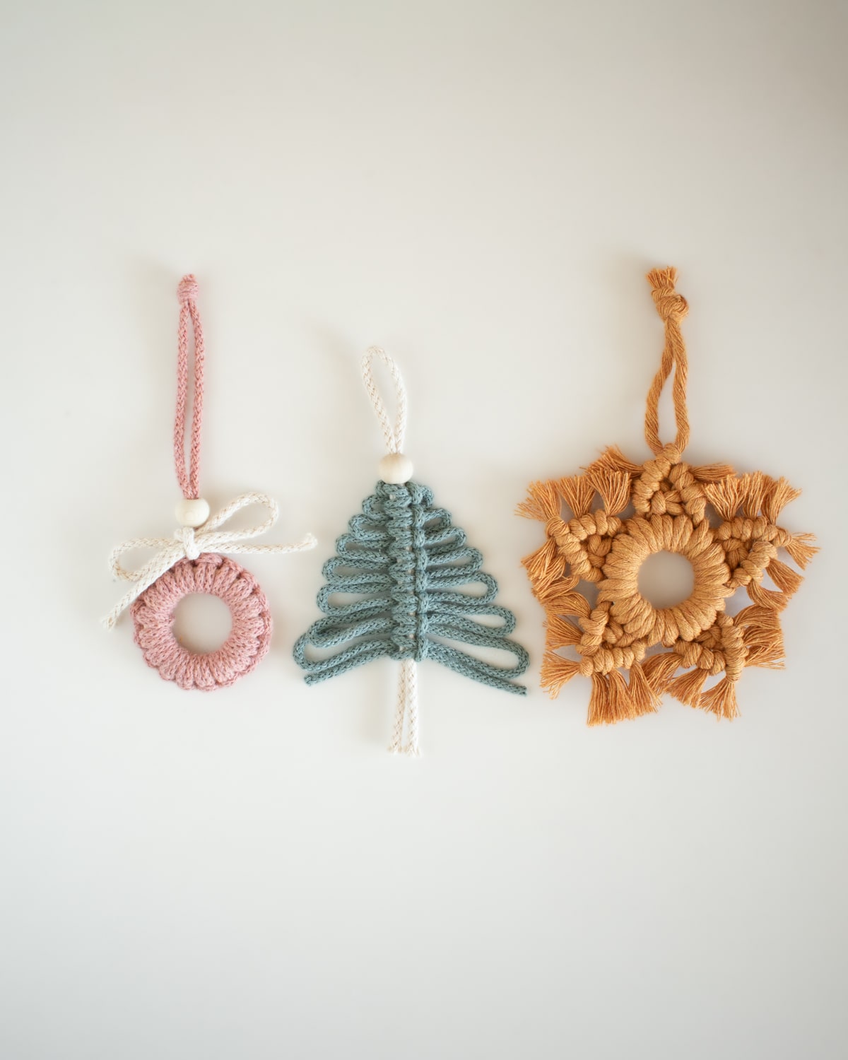 Contenido del set de 3 kits macramé navideño: Cuerdas de algodón natural y reciclado / Argolla de madera / Cuenta de madera / Cinta de medir de papel / Masking Tape / Tutorial impreso / Video tutorial
