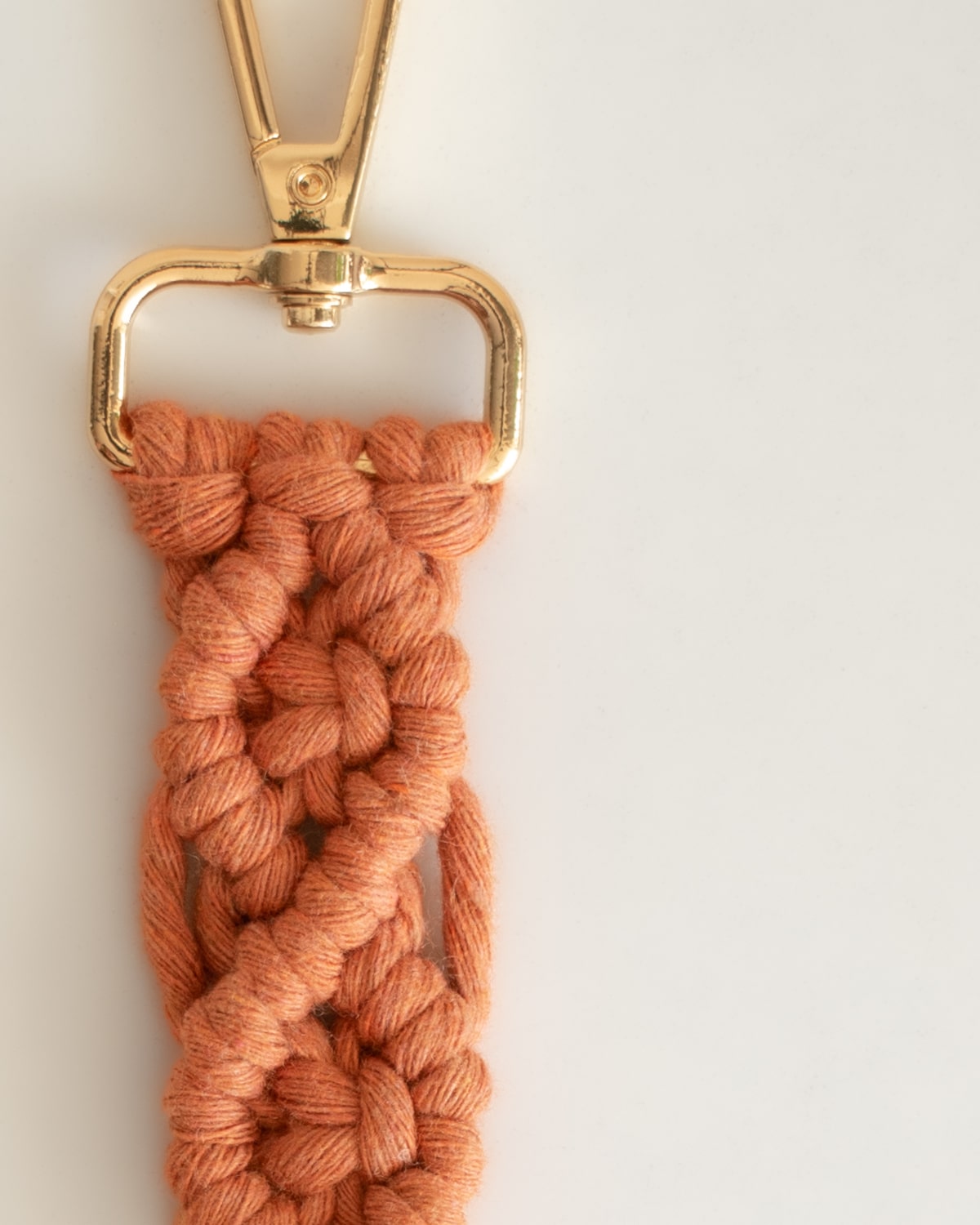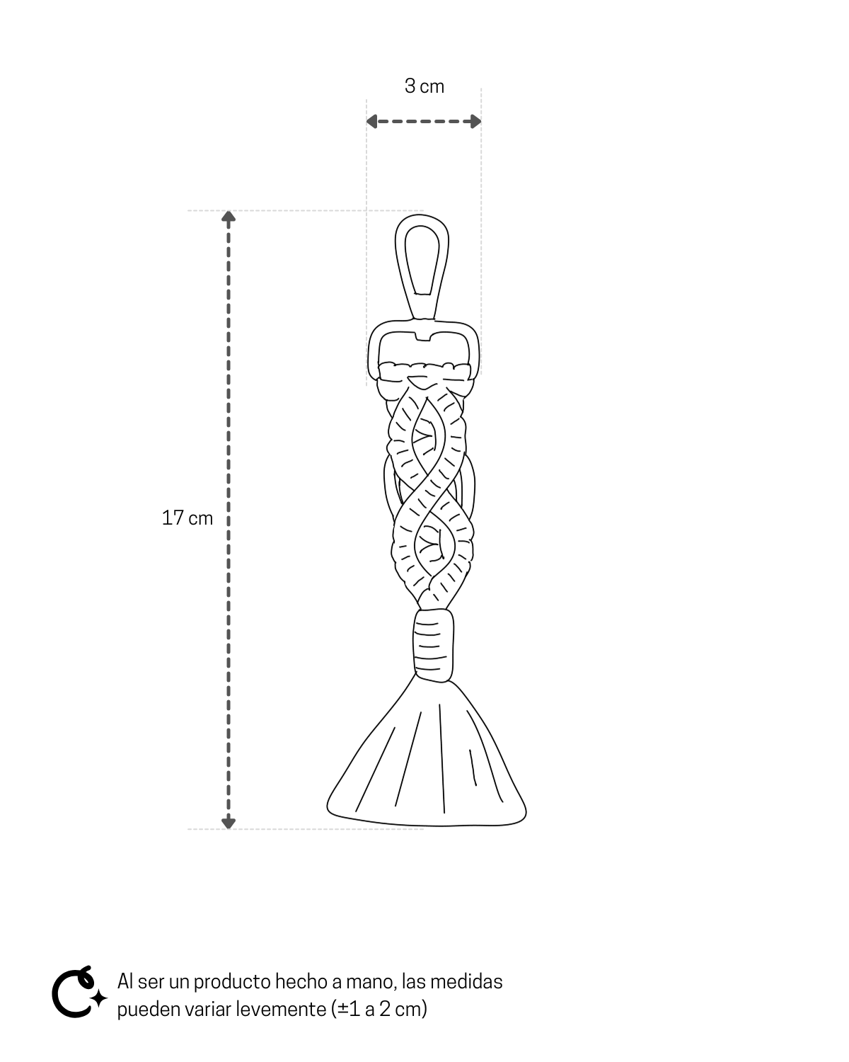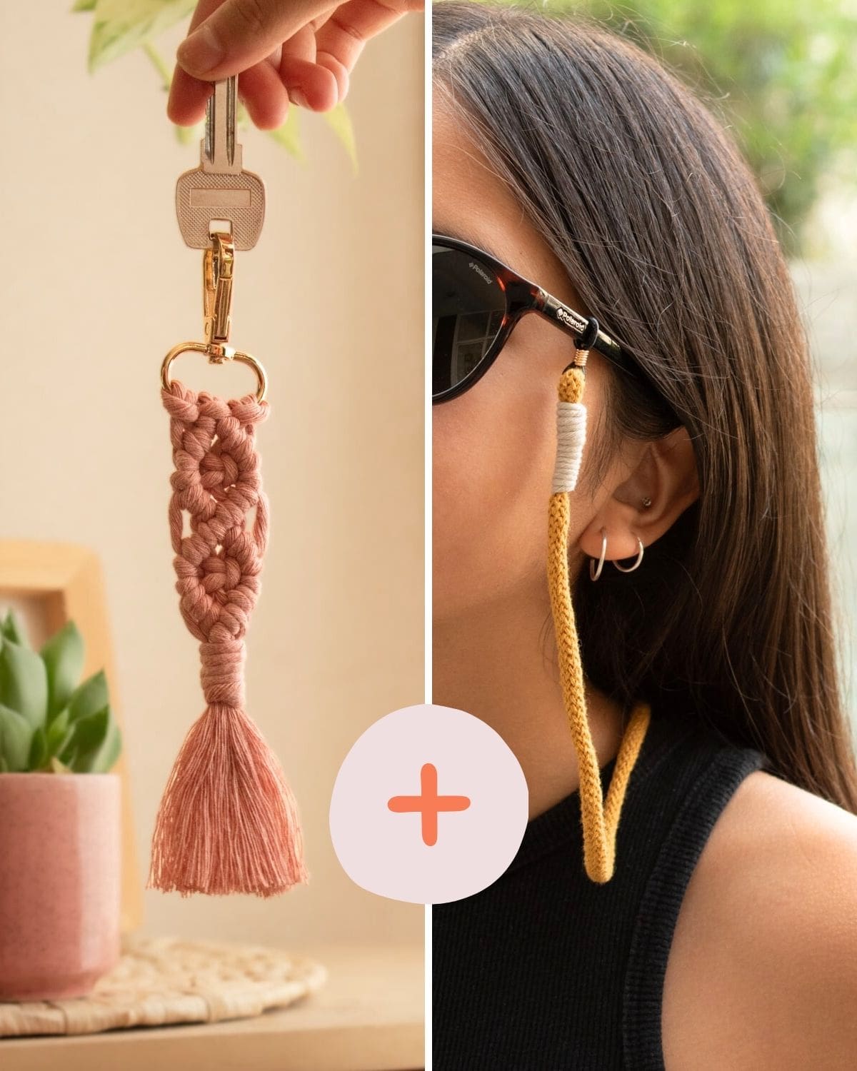 El llavero de macramé tiene un diseño de rombos anudados con un toque boho chic que combina fácil con distintos estilos. El strap de lentes es suave, liviano y ajustable, pensado para tener los lentes siempre a mano y evitar que se caigan al agacharse.