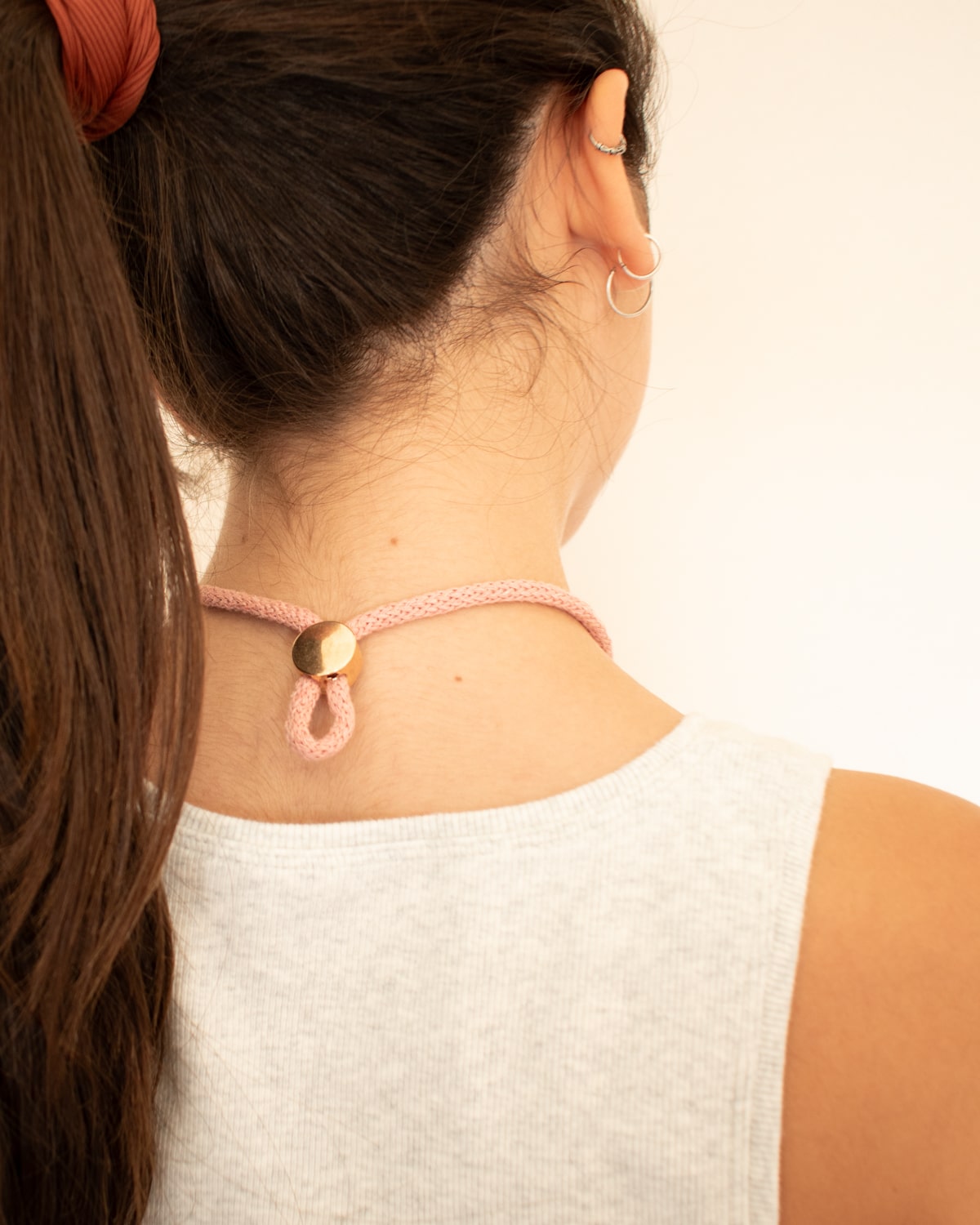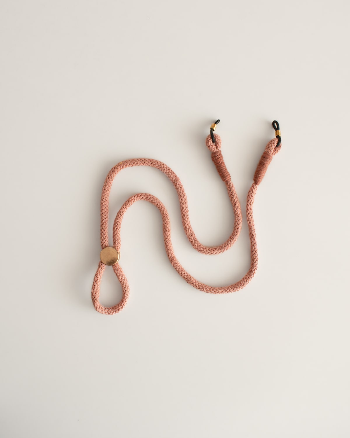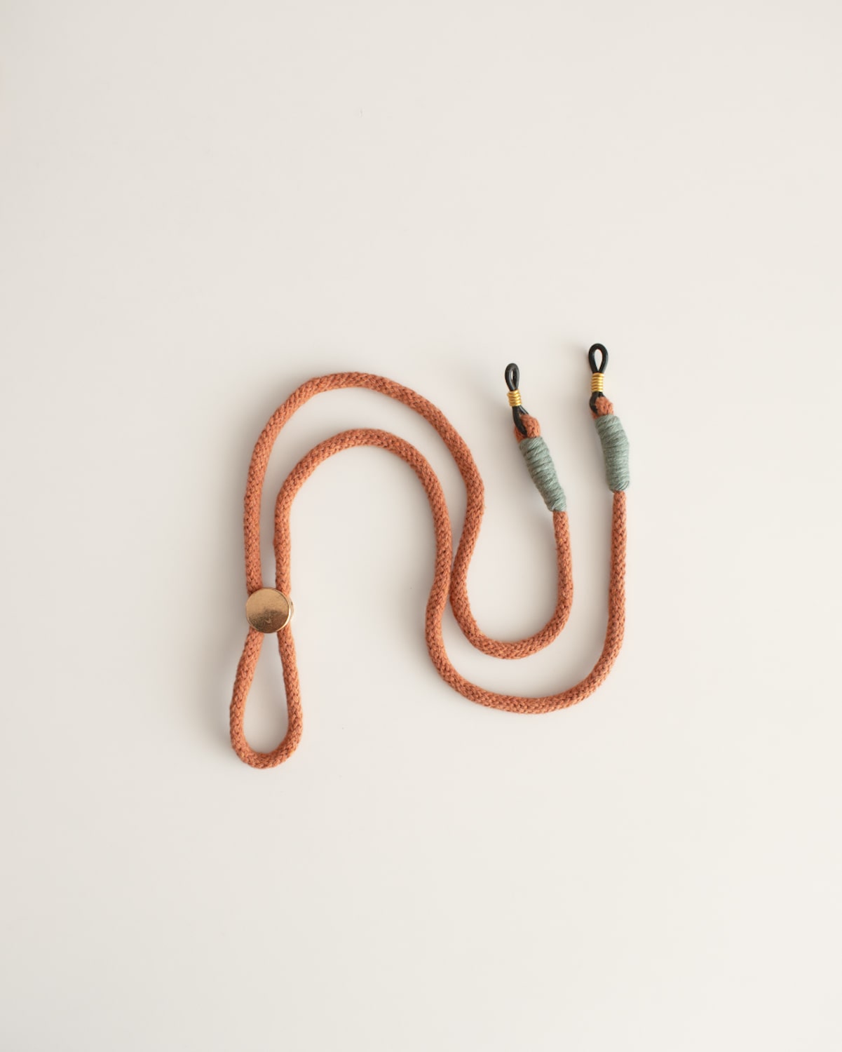 Material: Cuerdas de algodón natural reciclado – Mosquetón metálico dorado – Cuerdas de algodón natural reciclado – Tope y terminales metálicos dorados – Gomas de fijación a lentes.