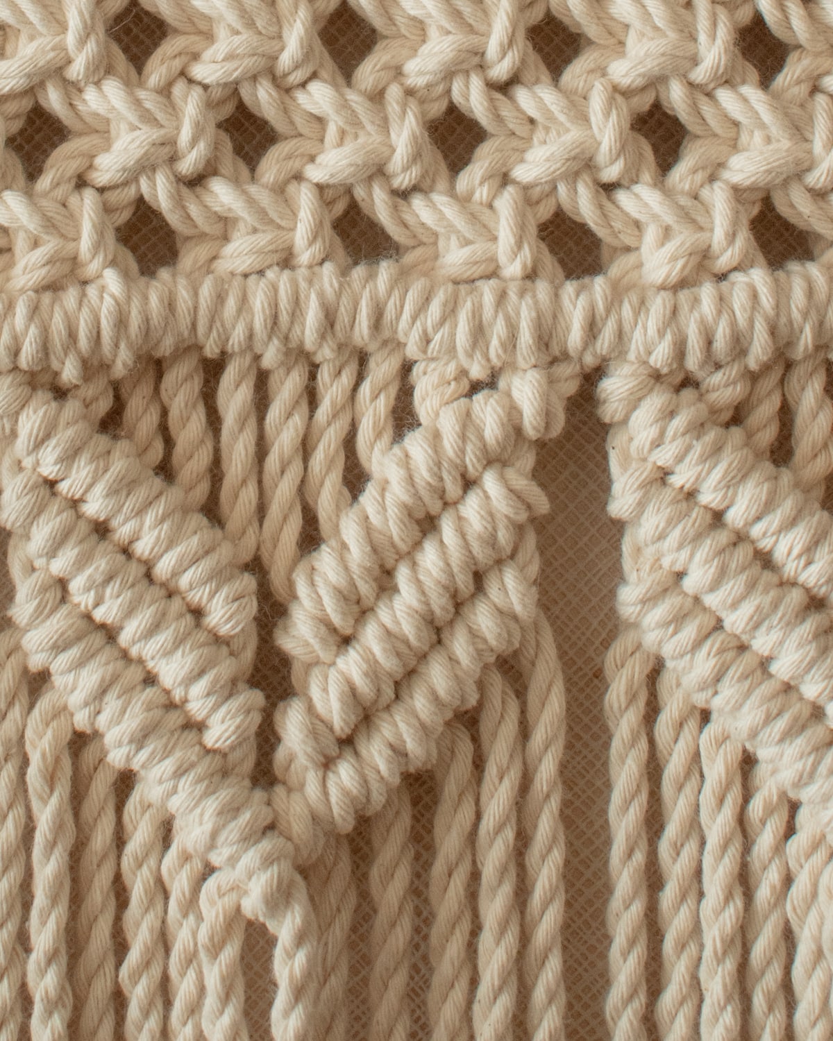 Anudado a mano con cuerdas de algodón natural y montado sobre una barra recta de madera, este mural de macramé tiene una forma estructurada y minimalista que se equilibra con un aire boho y relajado.