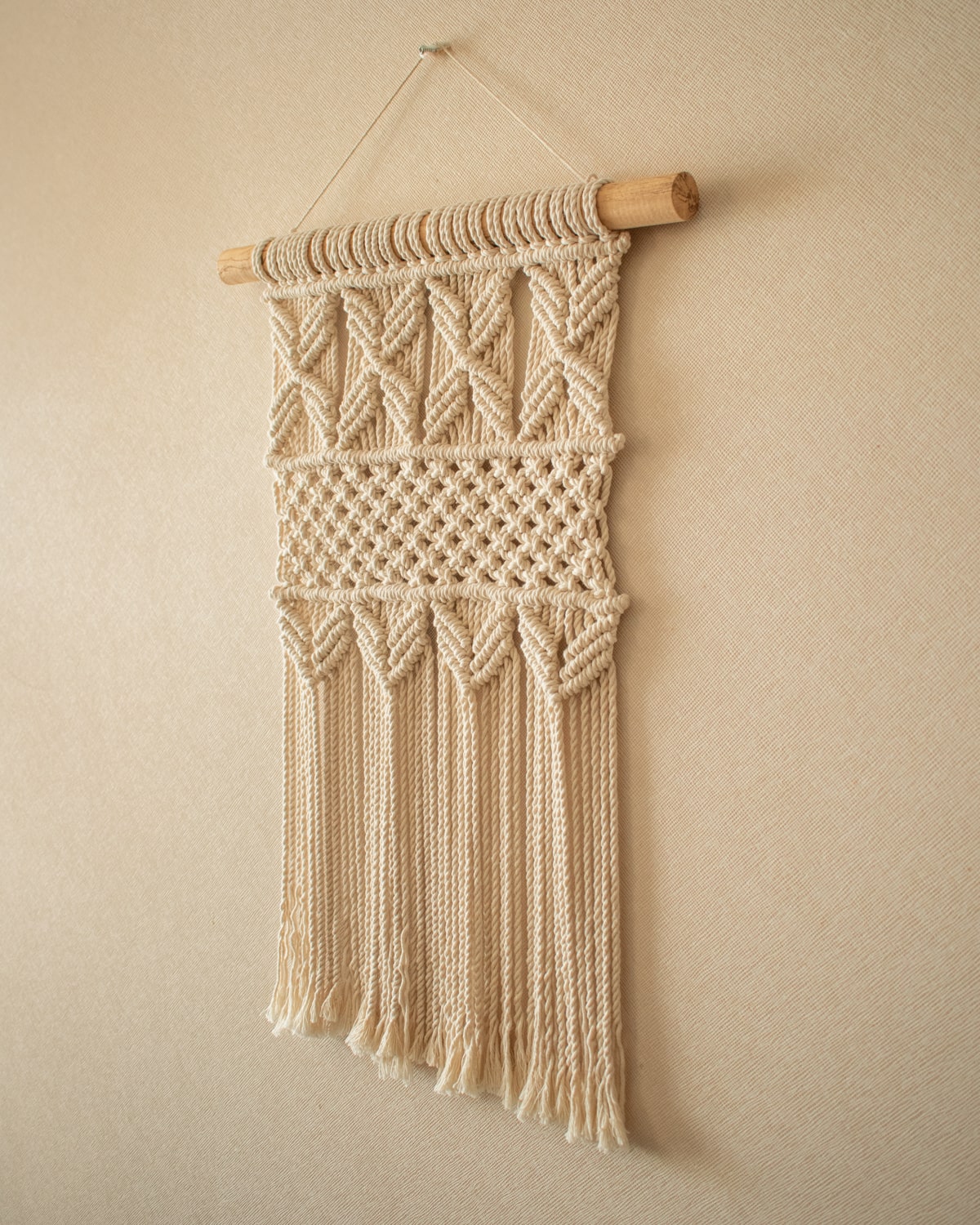 Con su diseño geométrico y alargado, este mural de macramé minimalista aporta orden visual y equilibrio a cualquier rincón. Es ideal para muros estrechos o espacios verticales que necesitan sumar calidez y estilo sin recargar.